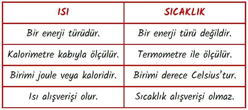 NOT: Isı ve Sıcaklık farklı kavramlardır.