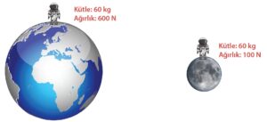 • Bir cismin farklı gök cisimleri üzerinde ölçülen ağırlıkları farklı değerler alır. Aynı cismin ağırlığı, büyük kütleli gezegenlerde fazla; küçük kütleli gezegenlerde azdır.
