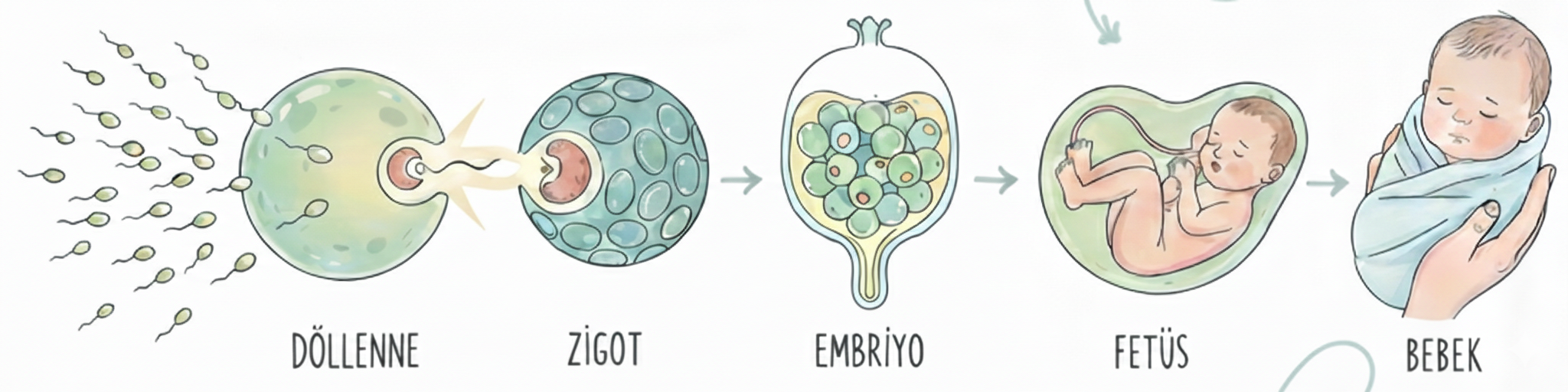 Yumurta ile sperm dişinin yumurta kanalında birleşerek döllenme olayını sağlar. Döllenmiş yumurtaya zigot denir. Zigotun gelişmesi sonucu embriyo oluşur. Fetüs embriyonun ikinci aydan sonraki adıdır. Daha sonra bebek gelişir ve dünyaya gelir.