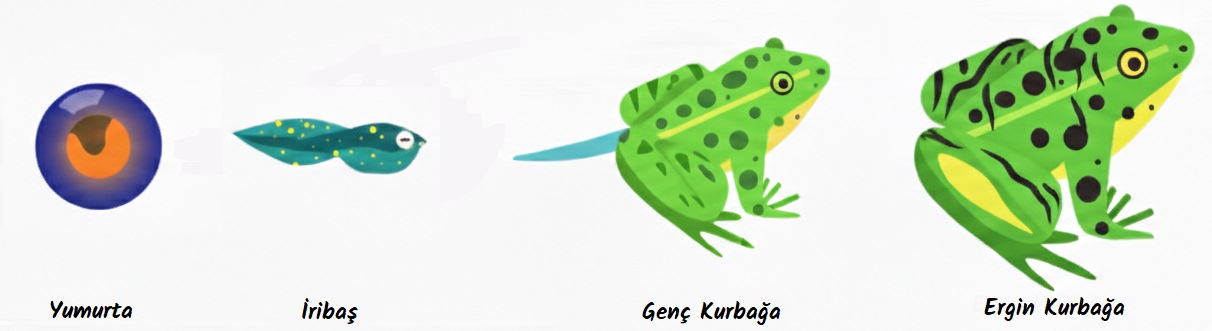 Kurbağalarda döllenmiş yumurta hücresinin gelişmesi sonucu embriyo oluşur. Embriyolar yumurtadan çıktığında iribaş adını alır. İribaş büyüdükçe önce arka bacakları, sonra ön bacakları çıkar ve kuyruğu yok olur. Genç kurbağa zamanla gelişerek yetişkin kurbağaya dönüşür.