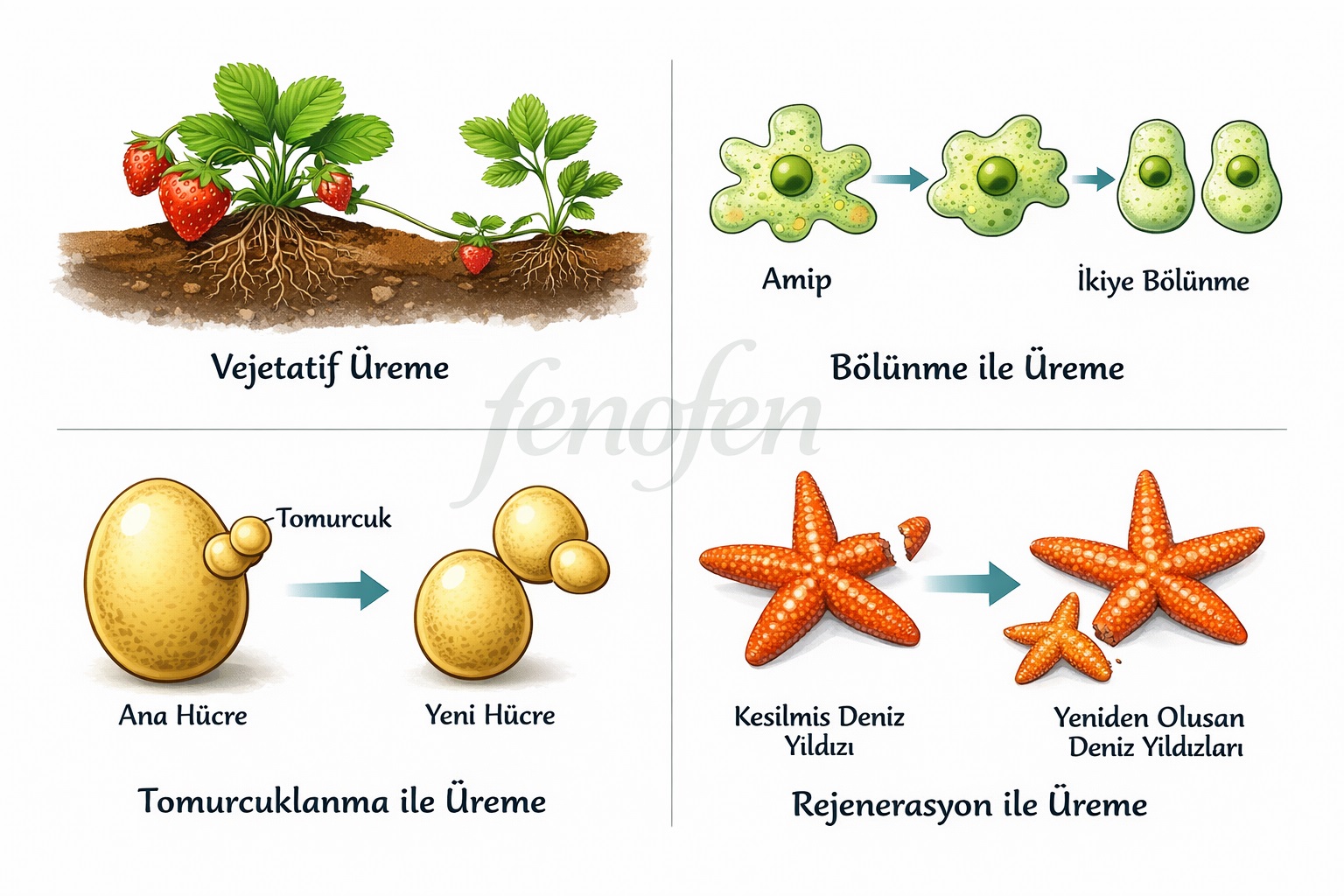 Rejenerasyonla üreme: Bazı canlılarda ana canlıdan kopan parçanın eksik kısımlarını tamamlayarak yeni canlı oluşturmasına denir. Denizyıldızı, planarya (yassı solucan), sülük ve toprak solucanlarında görülen bir çoğalma şeklidir.