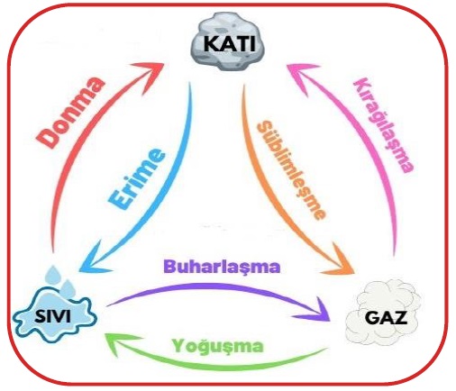 Kırağılaşma: Gaz haldeki bir maddenin çevresine ısı vererek sıvı hale geçmeden direk katı hale geçmesine denir.