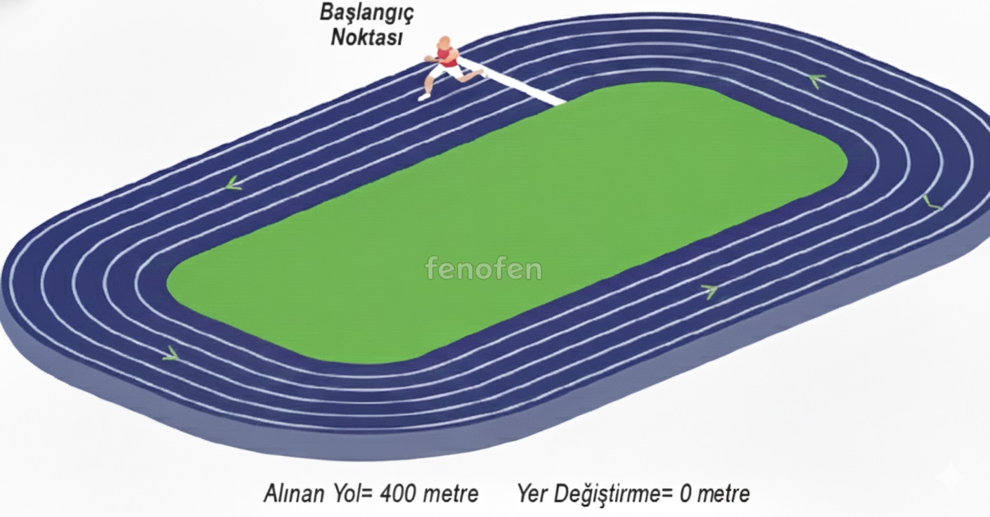 Verilen görselde başlangıç noktasından harekete başlayan sporcu tekrardan başladığı noktaya geldiği anda, sporcunun toplam aldığı yol yani alınan yol 400 metre iken, yer değiştirme miktarı tekrardan başladığı noktaya döndüğü için 0 metredir.