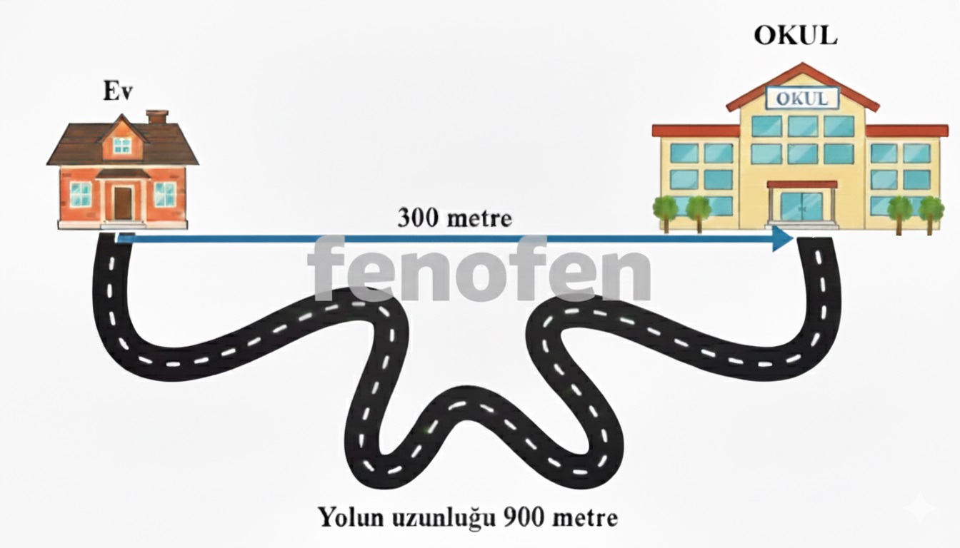 Verilen görselde evden okula gitmek isteyen bir kişinin aldığı yol miktarı 900 metre, yer değiştirme miktarı ise 300 metredir. Alınan yola bakılırken hareketlinin toplam gittiği yola bakılır. Yer değiştirme miktarına bakılırken iki nokta arasındaki en kısa mesafeye bakılır.