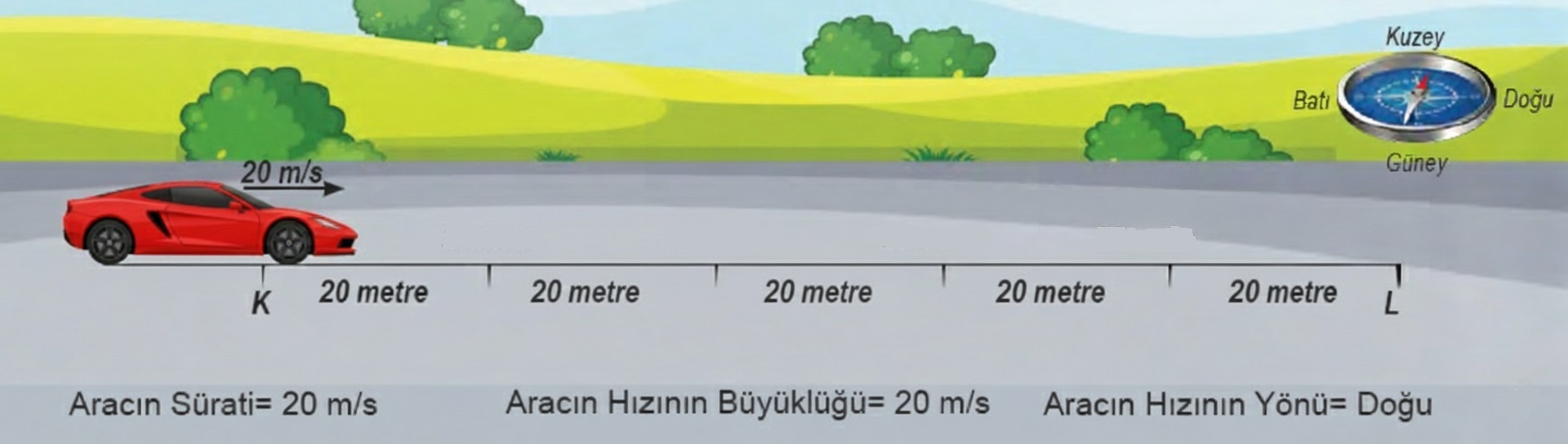Araç, her bir saniyede doğu yönünde 20 metre yer değiştirmiştir. Eşit zaman aralıklarında, aynı yönde, eşit miktarda yer değiştirdiği için araç sabit hızlı hareket etmiştir. Aracın hızı, doğu yönünde 20 m/s olarak ifade edilir. Araç, 5 saniye sonunda 100 metre doğu yönünde yer değiştirmiştir.