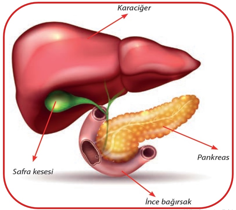 Karaciğer: Safra sıvısını salgılar. Bu salgı özel bir kanalla ince bağırsağa gönderilir. Safra sıvısı yağların fiziksel sindirimini gerçekleştirir.