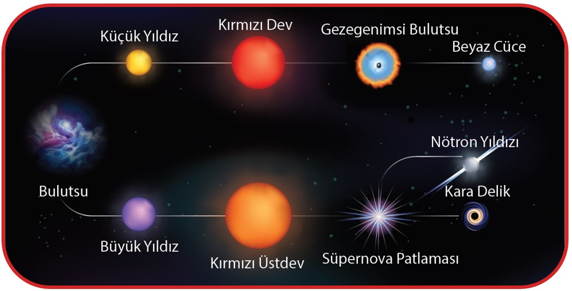 - Yıldızın başlangıç kütlesi büyükse Kırmızı Üstdev’e dönüşür. Sonra bu yıldızların hayatları süpernova patlaması ile son bulur ve yıldızdan geriye nötron yıldızları veya karadelikler kalır.